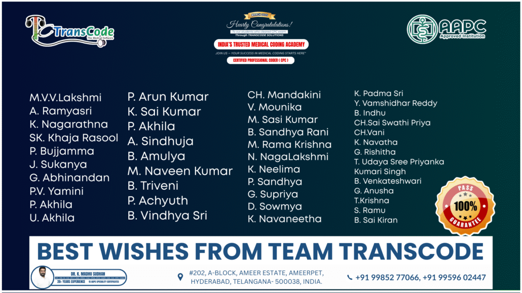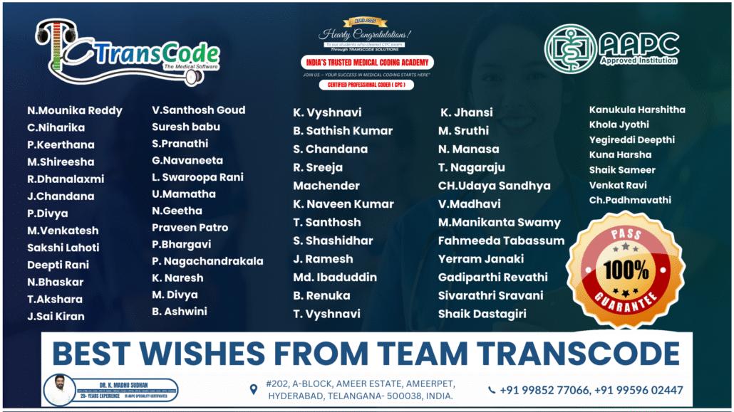 At TransCode, success is not just a goal—it’s a guarantee. Our students consistently achieve top results in the CPC exam. In fact, this photo captures the pride and joy of their accomplishment. With expert training, personalized guidance, and a supportive community, you can join this growing family of certified professionals. Moreover, we are committed to helping you succeed every step of the way. Your success story starts here!